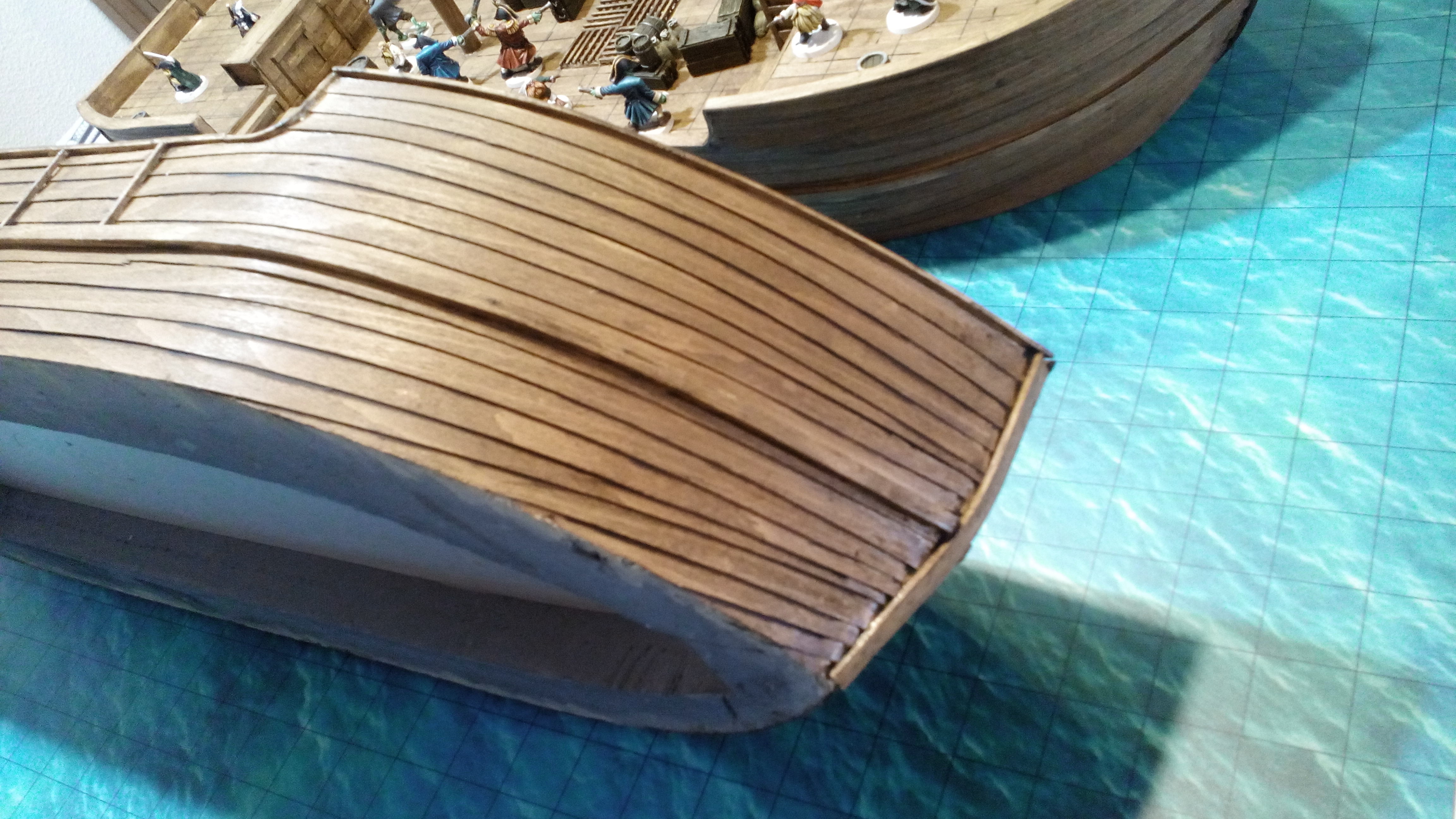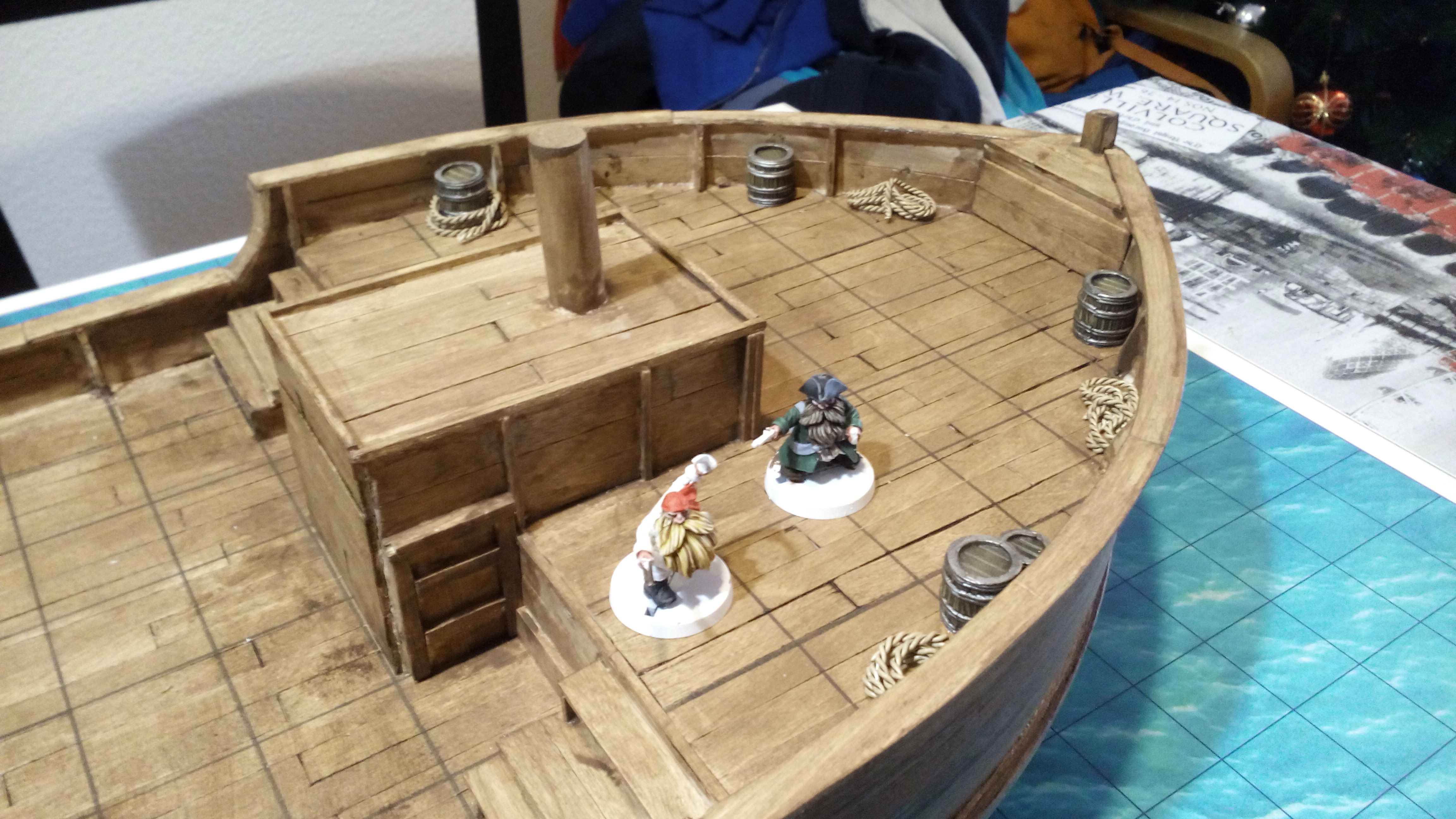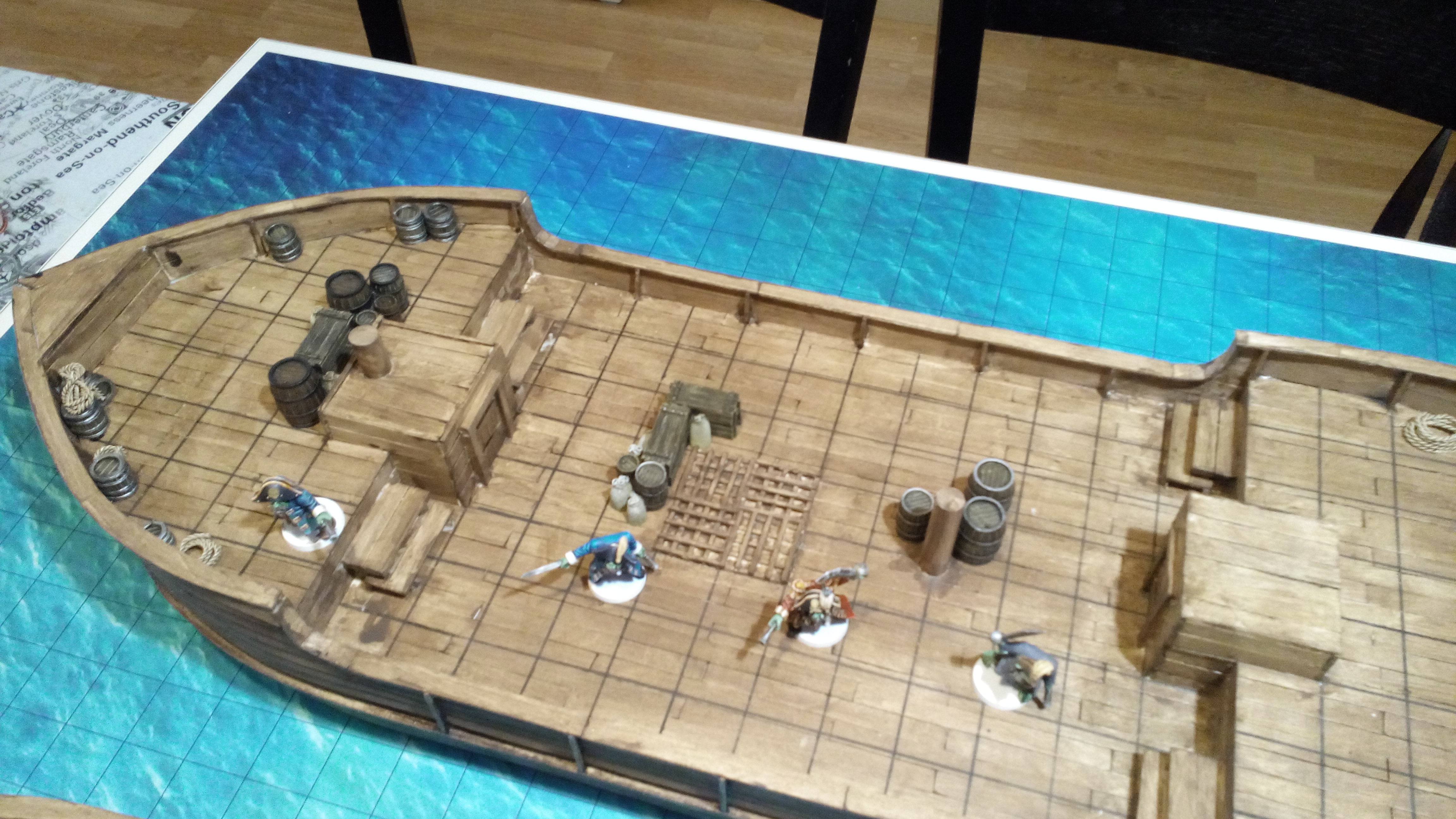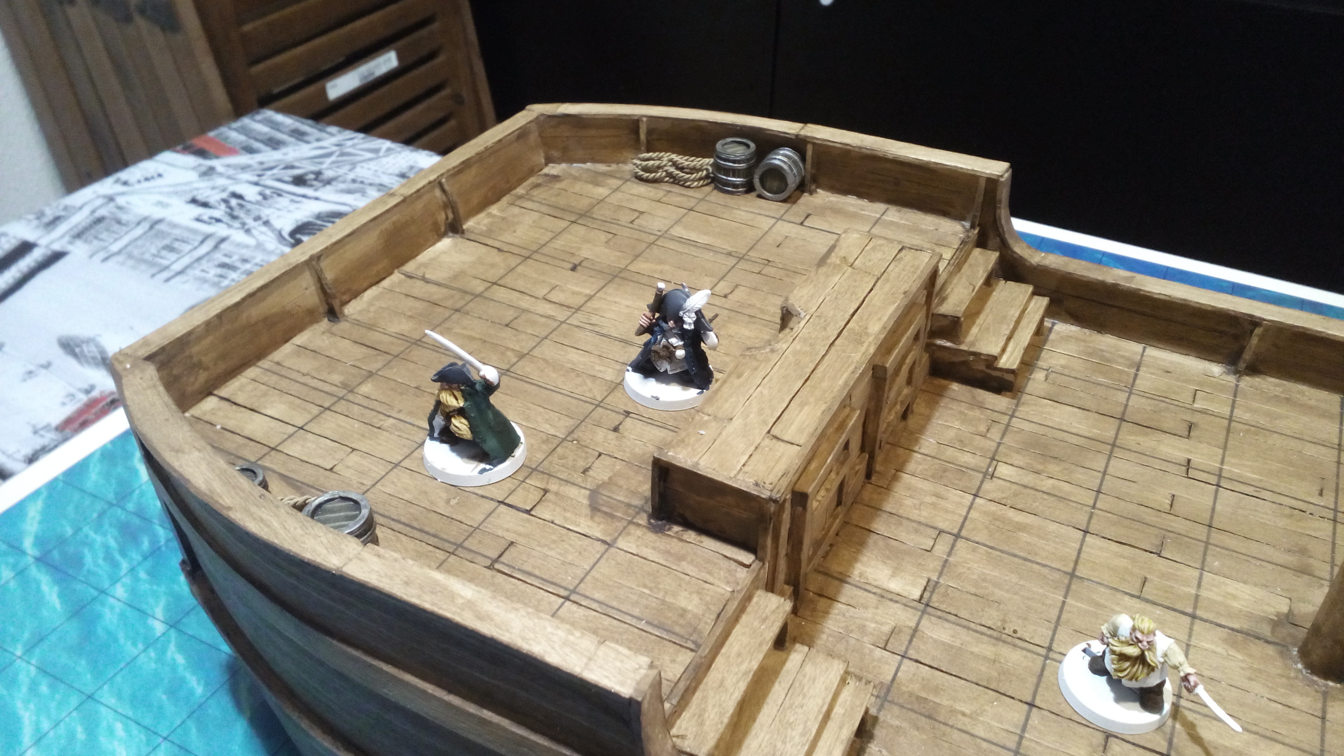 Debido a la forma del casco del barco. Os daréis cuenta que varias casillas quedan cortadas o no tienen el tamaño adecuado para colocar la peana de una miniatura. La solución es fácil, colocamos attrezzo en esa casilla para que las miniaturas no puedan usarla. Haciendo una disposición natural de los elementos crearemos una sensación magnífica de barco en plenas funciones de uso.