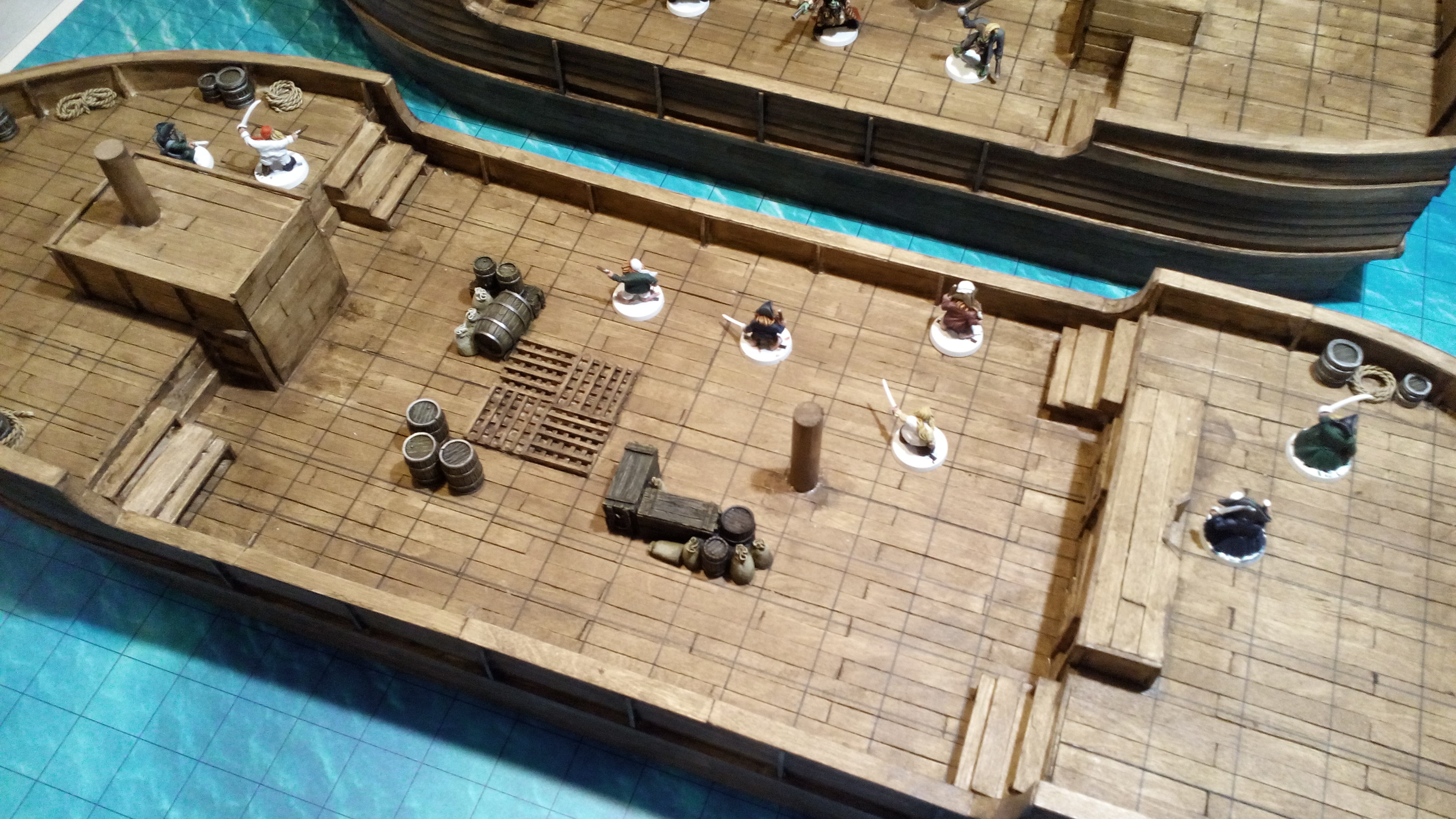 En mi caso disponía de unas piezas de resina de la marca Microrart que representan cajas de madera, barriles y sacos de mercancías. Gracias a que son elementos independientes, se pueden distribuir por la cubierta del barco, restringiendo el movimiento de las miniaturas por la cubierta, y haciendo las partidas mucho más entretenidas.