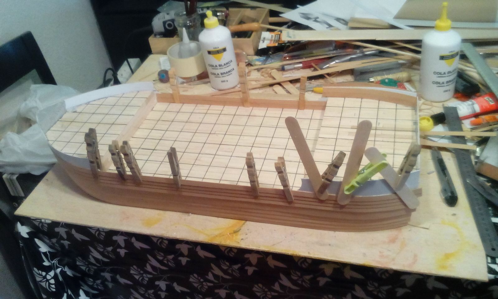 Una vez seco, utilicé hoja de madera (de la que se utiliza para forrar muebles y tableros) cortada en tiras de 0.5cm y de la longitud del barco, pegada con cola de contacto. IMPORTANTE! No utilizar cola blanca, ya que la madera absorbe el agua de la cola y se curva, haciendo inservible la pieza.