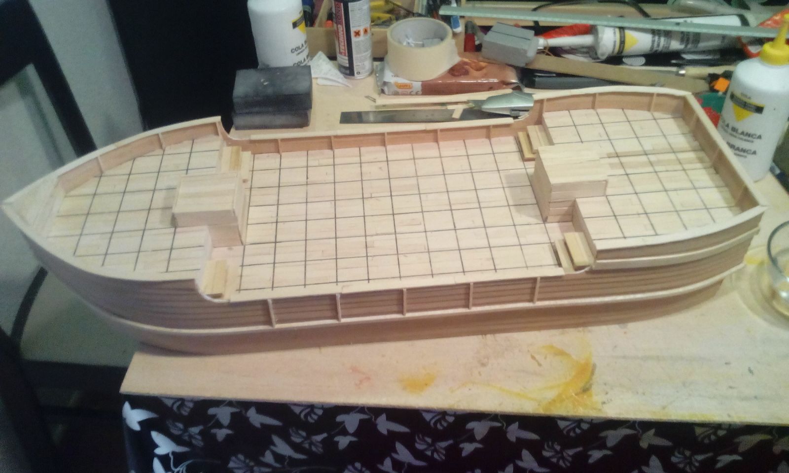 Una vez hacho eso lijé la superficie de la cubierta y pegué los palos contrapeando cada línea de madera con la siguiente para que las juntas de cada palo no coincidan con la línea anterior ni posterior.
