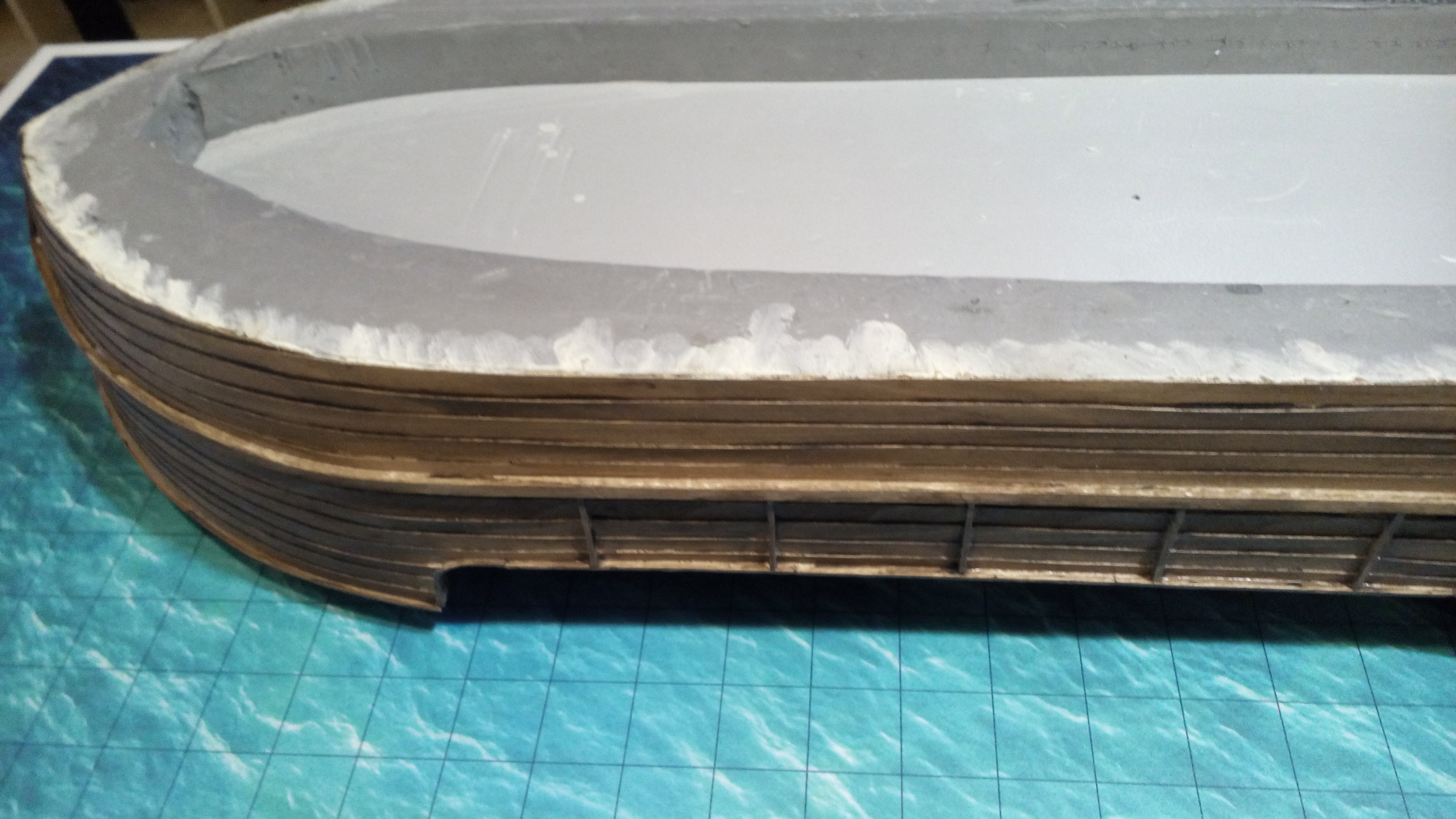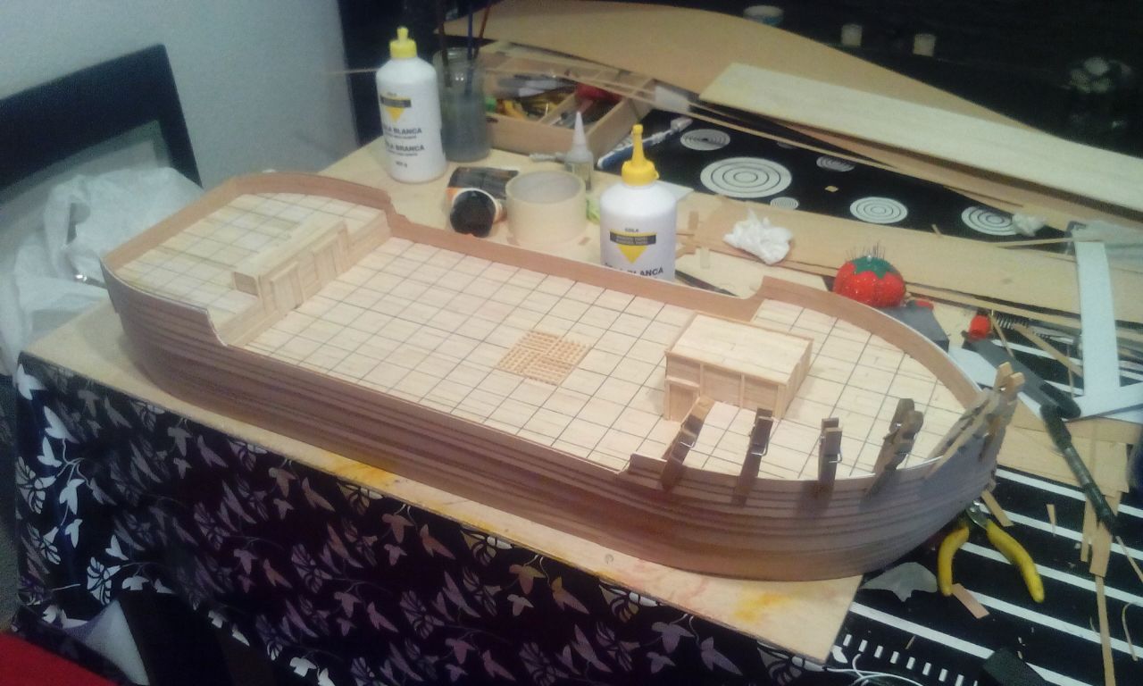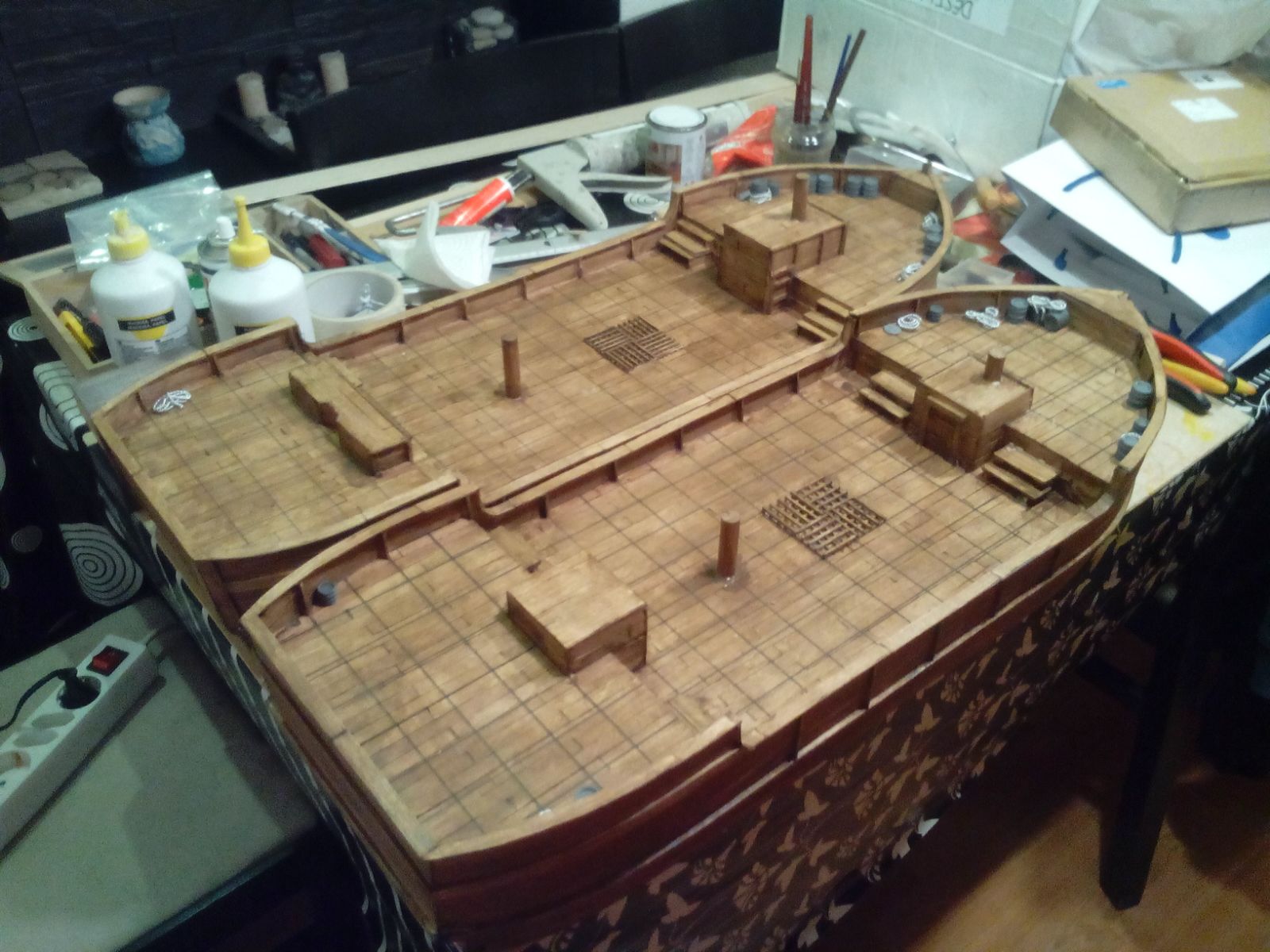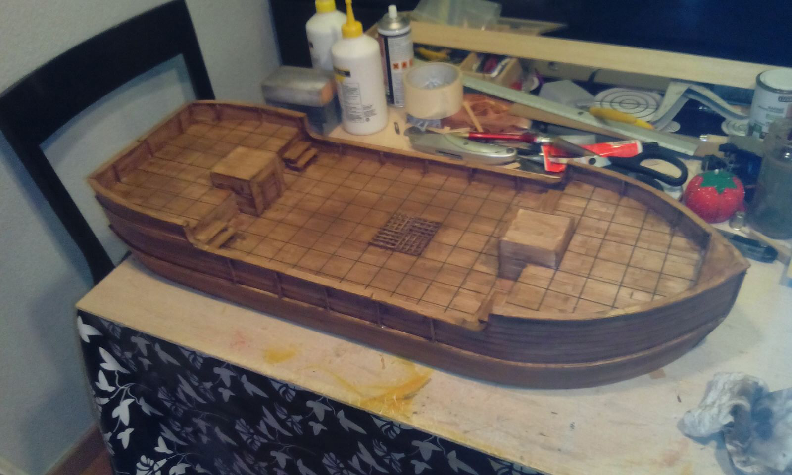 Una vez terminado, me di cuenta de que no había colocado los mástiles en su posición, por lo que realicé dos agujeros en la cubierta y coloqué listones redondos para representar los mástiles. En un futuro crearé los mástiles y las velas para la versión no jugable de exposición.