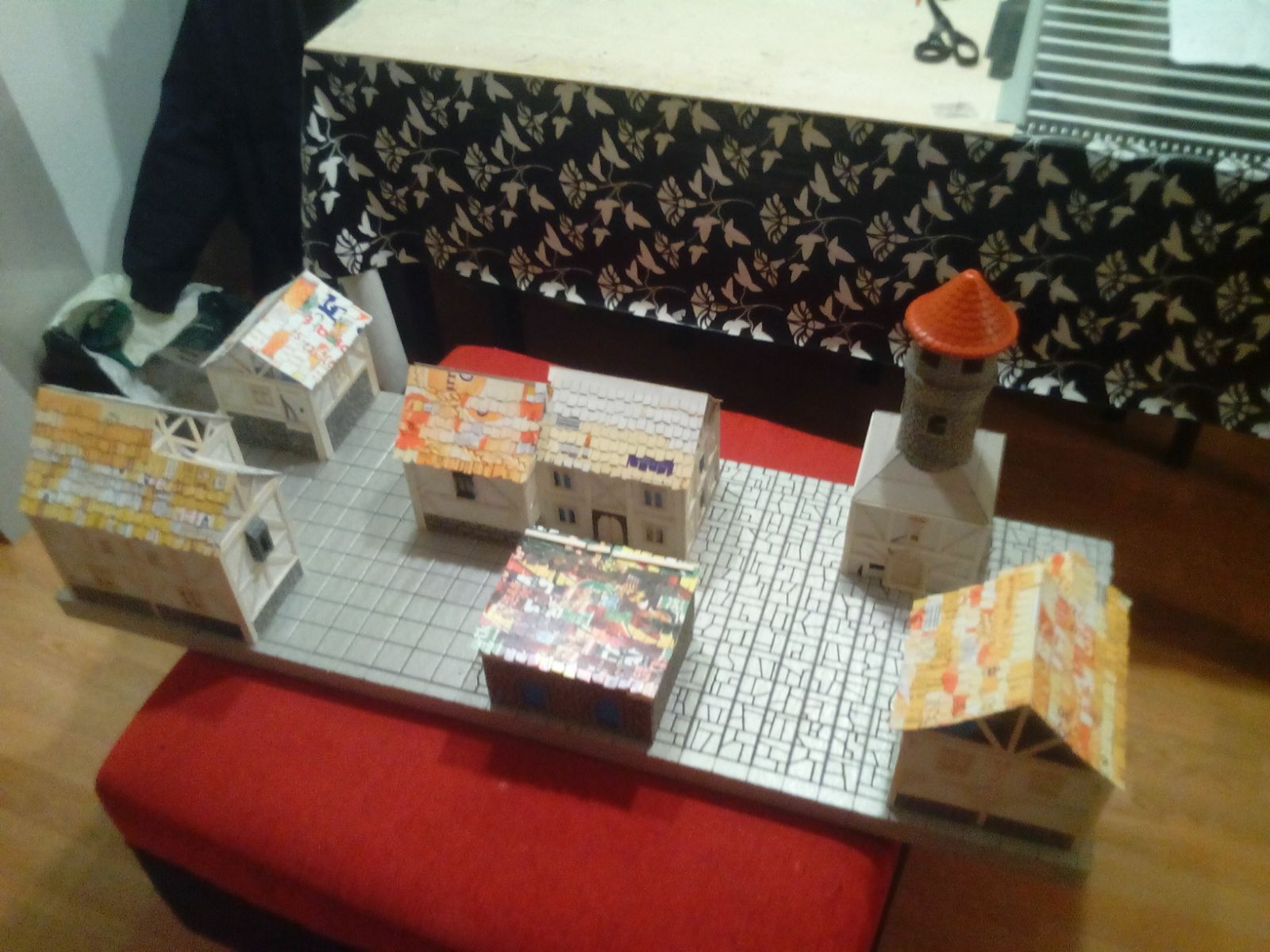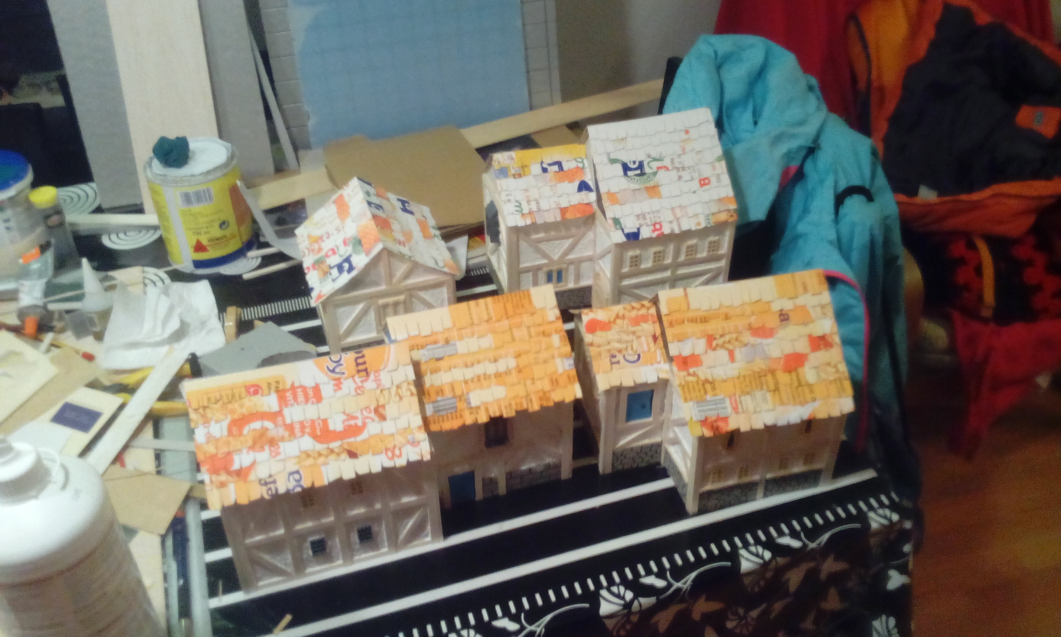 Gracias a un castillo de juguete viejo de mi hijo, pude reciclar los muros con textura de piedra para poner en la parte inferior de los muros de las casas. Lo que le da un toque genial al diseño de las mismas.