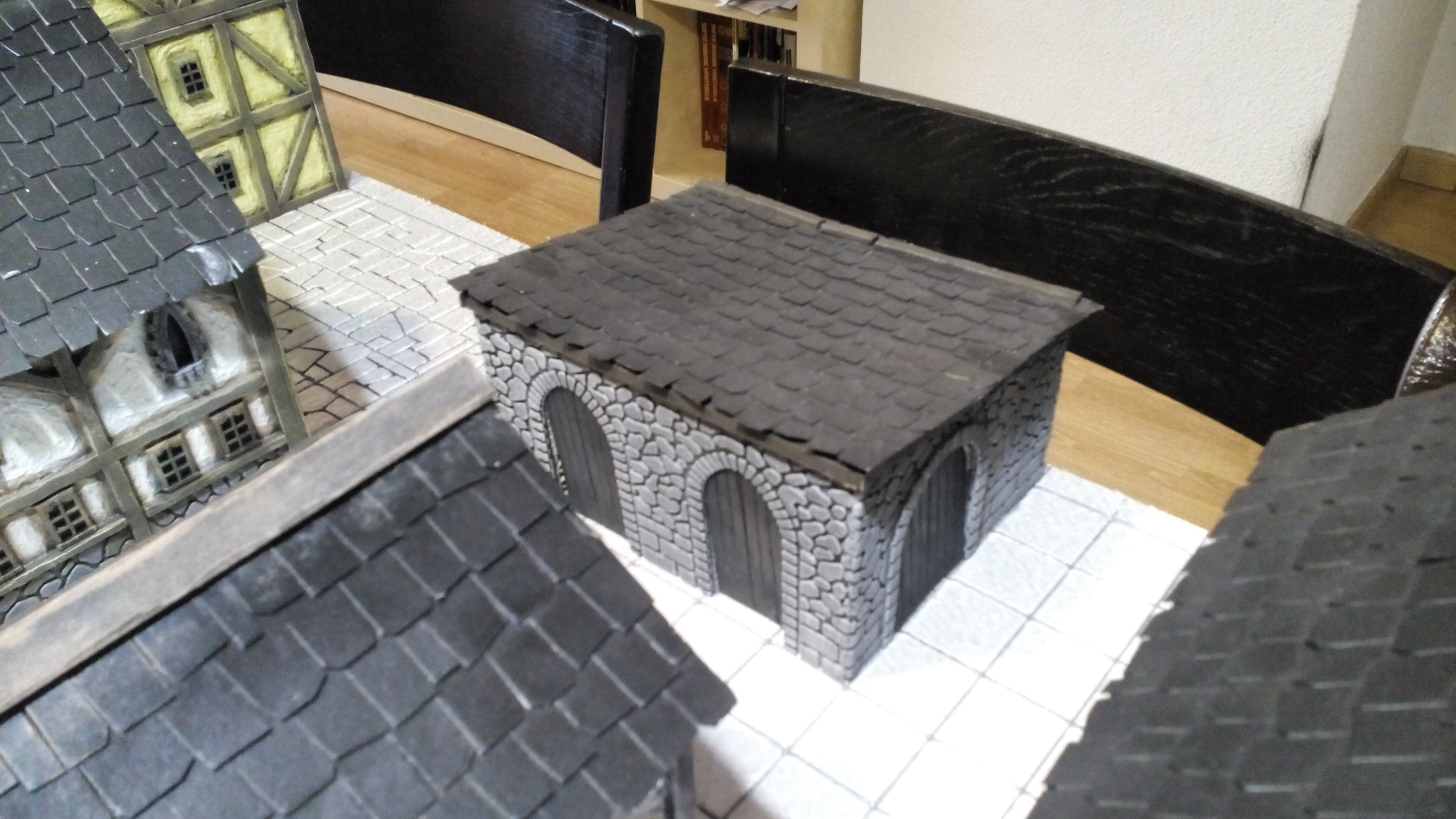Para crear la estructura, utilicé una sencilla estructura de H con las fachadas triangulares a los lados unidas por una pieza central. una vez seco, coloque piezas rectangulares de cartón de 1mm sobre las que irán pegadas la tejas.