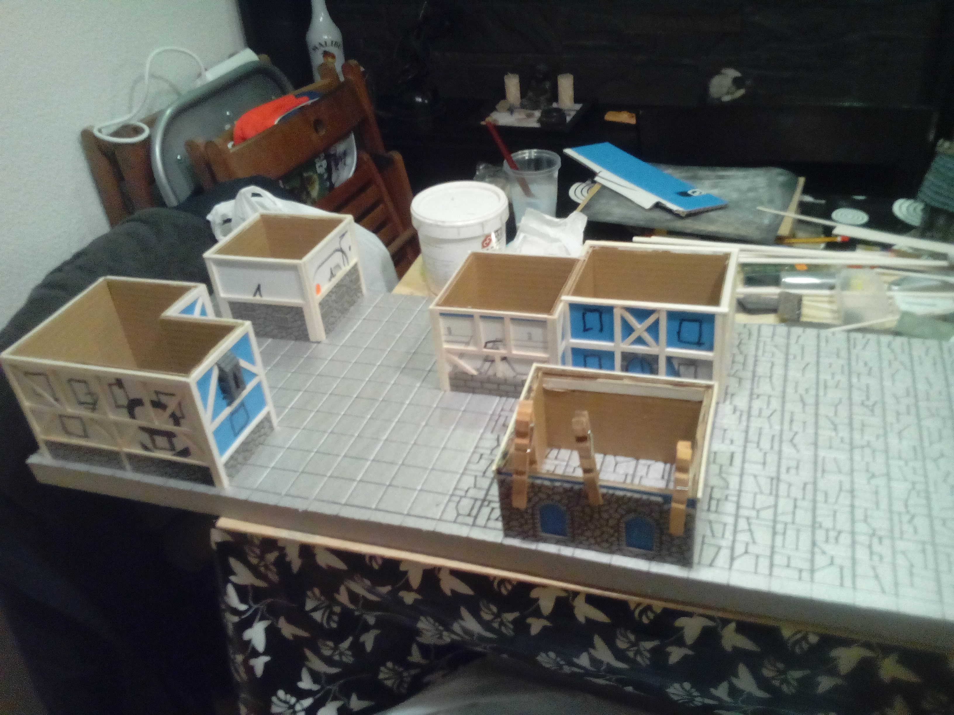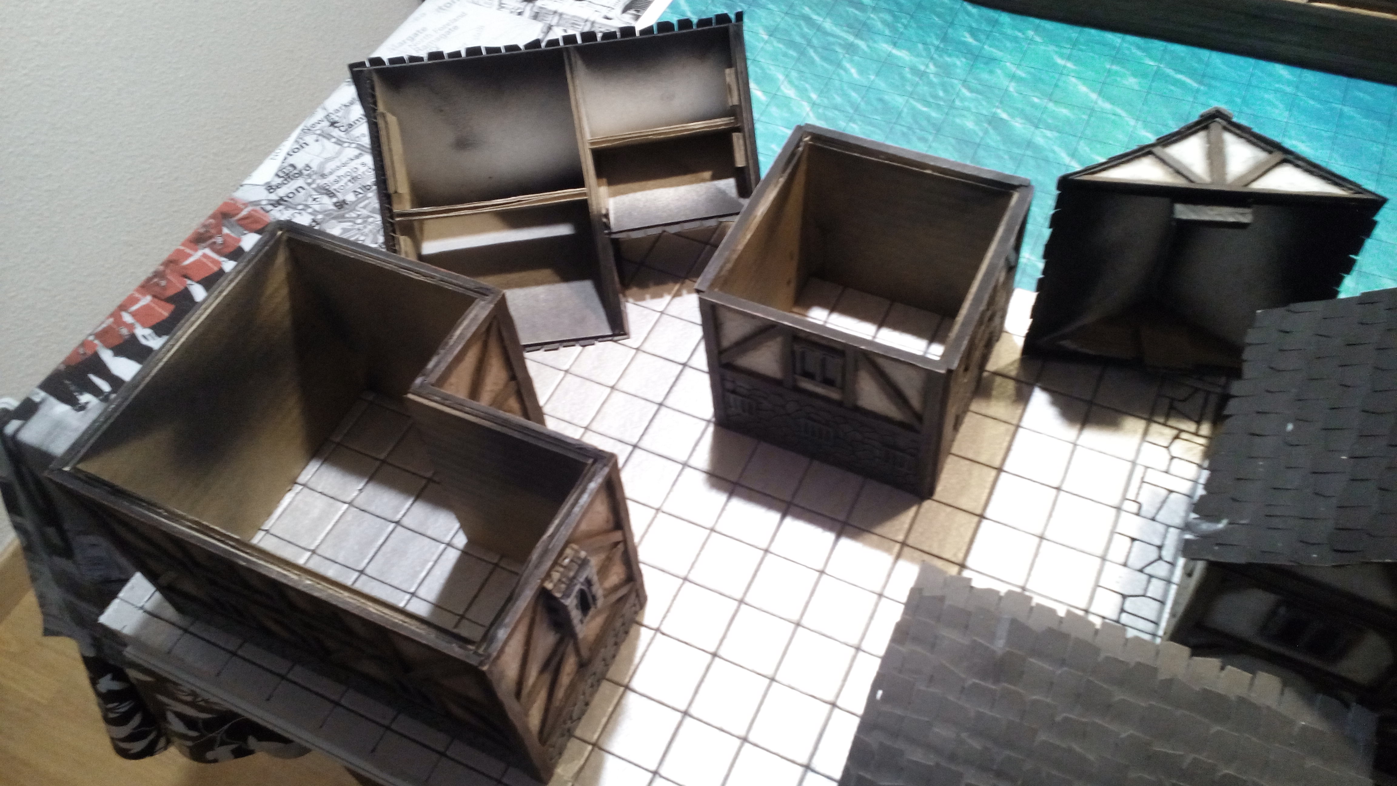 Corté las piezas que necesitaba para las casas realizando las paredes por un lado y las piezas para los techos por otro, para en un futuro poder quitar los techos y jugar en los interiores de las casas. al ser un juego de miniaturas con casillas las medidas para el diseño fueron muy fáciles, ya que cada casilla media 3x3cm. Simplemente usaba la cantidad de casillas que quería que ocupara.