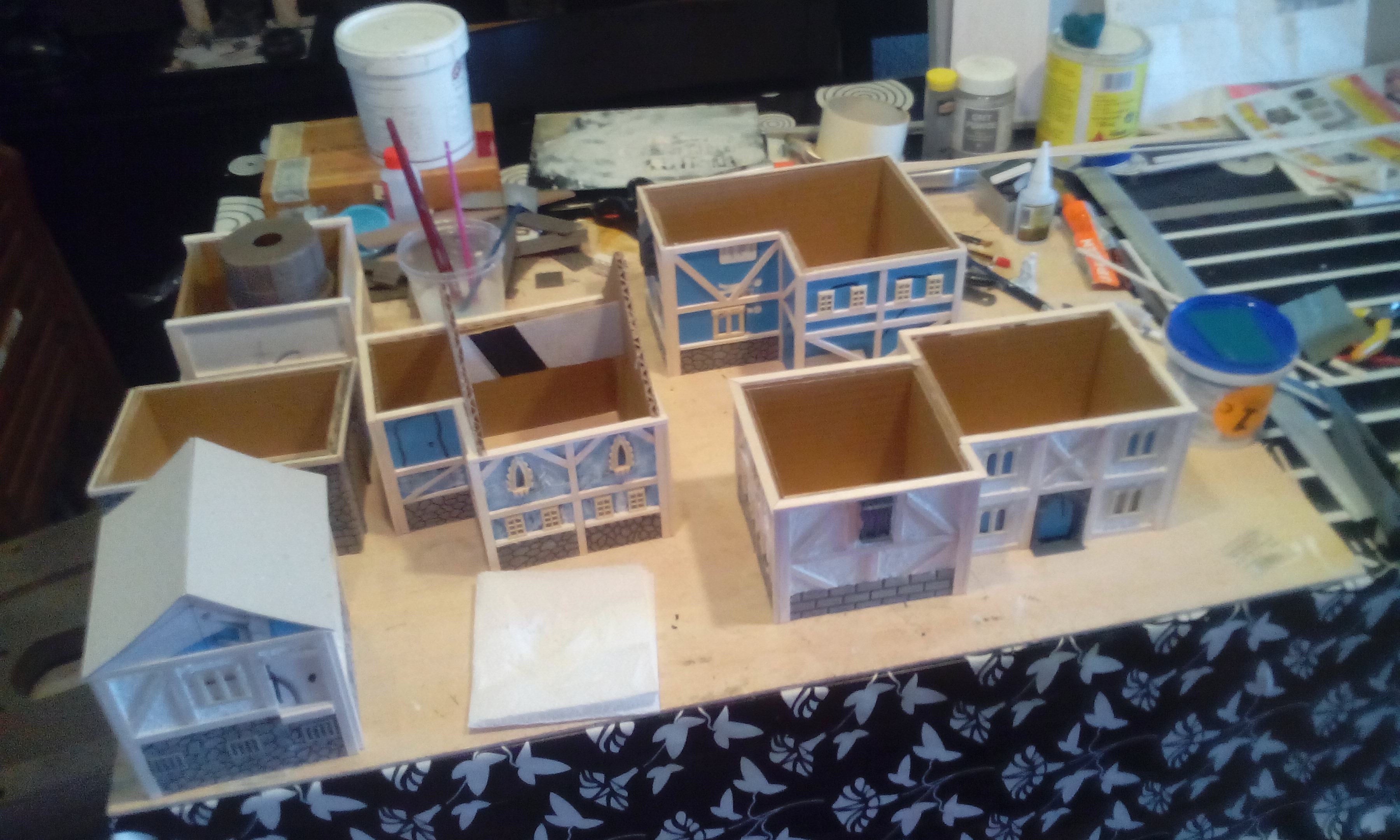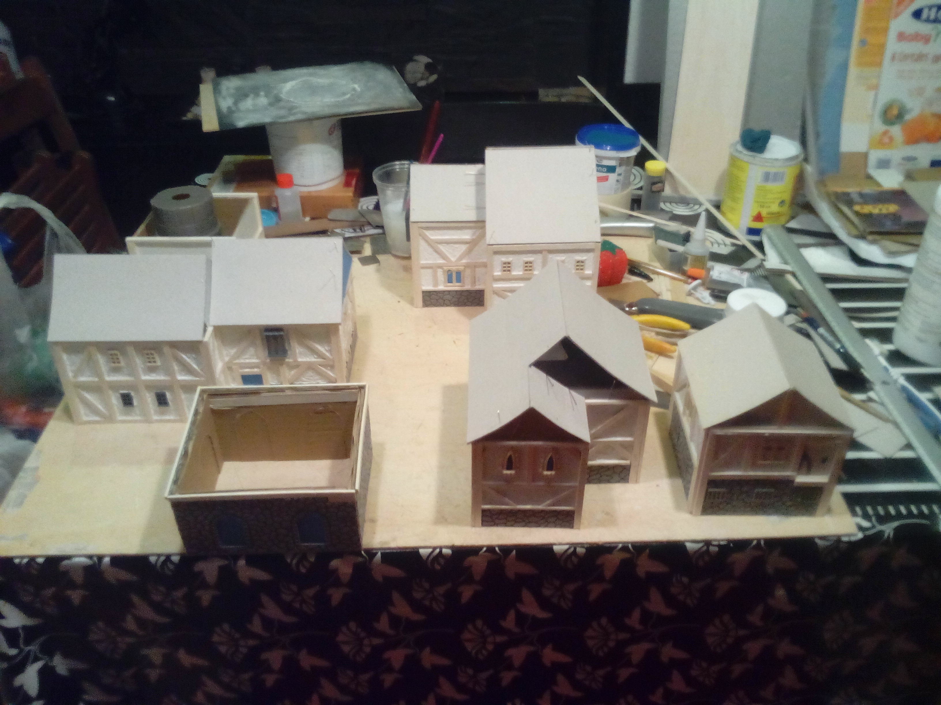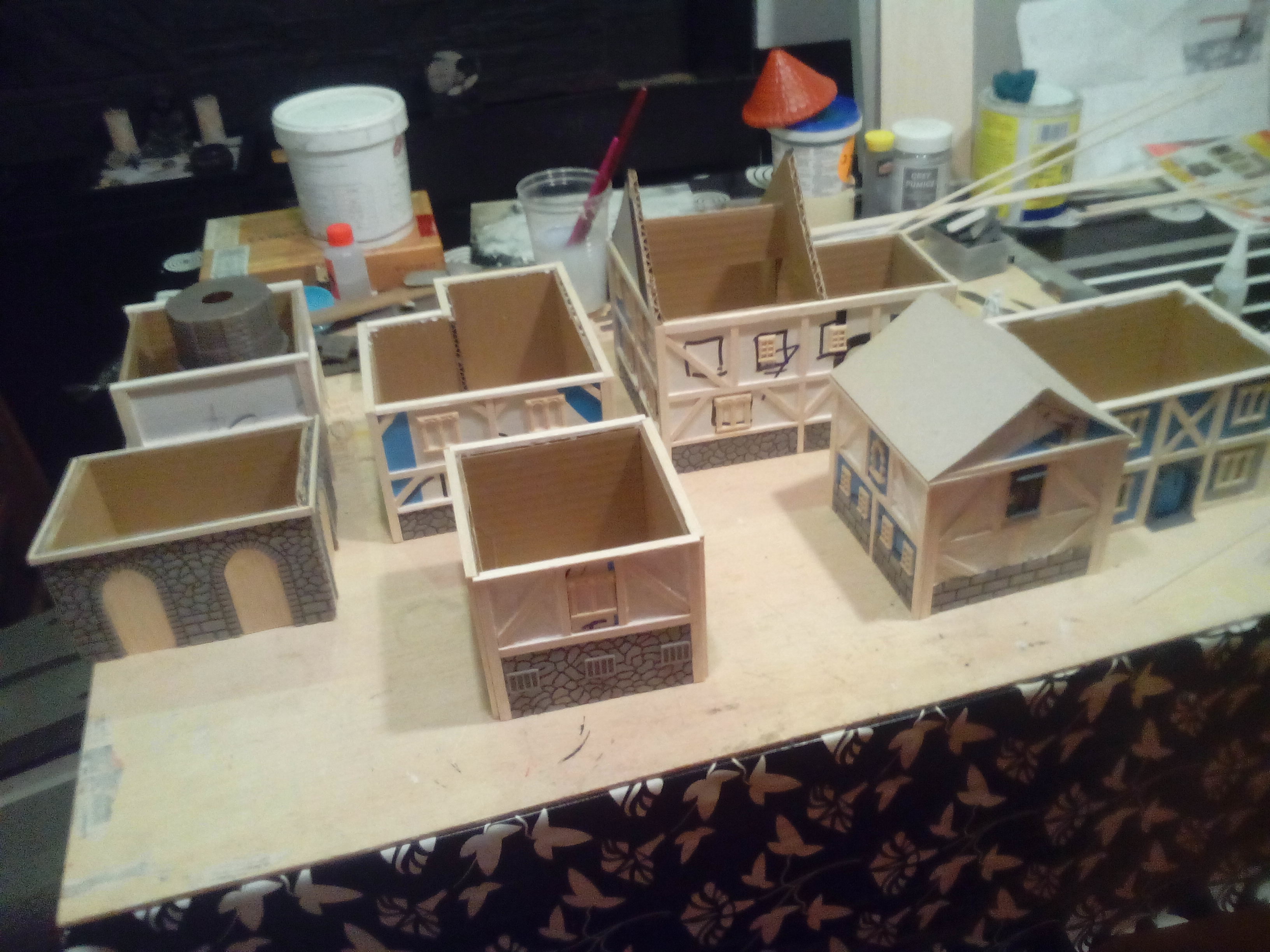 Lo primero que hice para poder pintar, fue darle a todas las casas una imprimación con spray de pintura negro mate y una vez seco, comencé a aplicar varias capas de pincel seco marrón a las vigas de madera. consiguiendo un efecto de madera vieja.